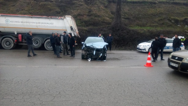 Olay, Ereğli Belen Mahallesi Belen Sanayi Sitesi girişinde meydana geldi. 67 LP 617 plakalı otomobil sürücüsü köpeğe çarpmamak için frene basınca direksiyon hamiyetini kaybederek karşı şeritten gelen Ereğli Belediyesi Fen İşleri Müdürlüğe ait hizmet aracına çarptı. Yaşanan kazada araçta büyük çapta maddi hasar meydana gelirken, kazayı hafif yaralı olarak atlatan 67 LP 617 plakalı araç şoförü, olay yerine gelen ambulansla Ereğli Devlet Hastanesine kaldırıldı. Yaralının sağlık durumunun iyi olduğu ve tedavisinin devam ettiği öğrenildi. Savcılık kaza ile ilgili soruşturma başlattı.