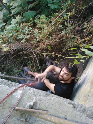 Olay ilçeye bağlı Akarca mahallesinde meydana geldi. Alınan bilgilere göre köpeklerinin havlaması üzerine balkona çıkan Ramazan Ongun, köpeklerinden TİNA isimli Cane Corso cinsi köpeğinin zinciri ile uçurumun kenarında asılı olduğunu gördü. Onu kurtarmak için hamle yapan Ramazan Ongun da mahsur kaldı. Durumun bildirilmesi üzerine adrese gelen İtfaiye Ekipleri, yaptıkları çalışmanın ardından TİNA isimli köpek ve sahibi Ramazan Ongun’u kurtardı.