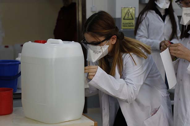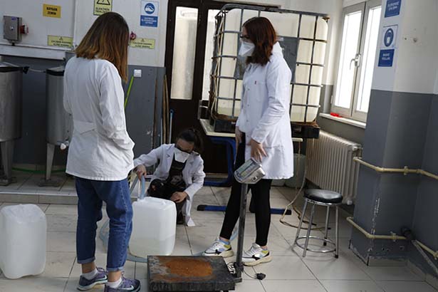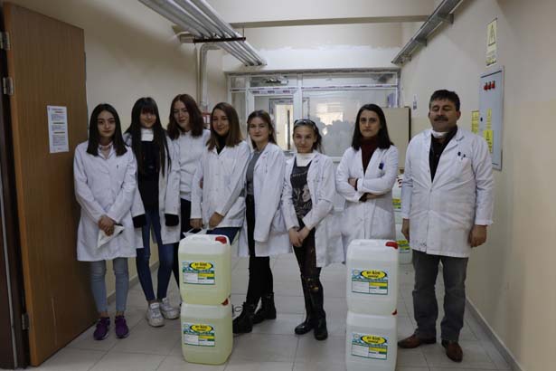 Korona virüsü için özel hazırlanan çözeltiyi Milli Eğitim Bakanlığının talimatıyla Zonguldak, Düzce ve Karabük illeri için hazırladıklarını ve sevkıyatlara başladıklarını ifade eden Eren Enerji Mesleki ve Teknik Anadolu Lisesi Müdür Yardımcısı ve Kimya Teknolojileri Alan Öğretmeni Ertuğrul Önal, “49 öğrencimizle burada kimya ile ilgili temizlik malzemelerinin üretimini yapmaktayız. 2019 yılının Aralık ayında üretimimize başladık. İlimizin ve ilçelerimizin okullarda kullanılan temizlik malzeme ihtiyacını karşılıyoruz. Geçen hafta Millî Eğitim Bakanlığımızın talimatıyla 8 il ve 26 meslek lisesinde bize de bu görev verildi. Korona virüsü ile ilgili özel bir çözelti hazırlıyoruz. Bu çözeltileri ayın 13’den beri yapıyoruz. Yaklaşık 4- 4,5 tona kadar çıkarttık. Hedefimiz bunu büyütmek. Sevkiyatlarımıza bugün itibariyle başladık. İnşallah en kısa sürede okullarımıza ulaşır ve dezenfekte çalışmasını yaparlar. Şu anda 3 ilimize dezenfektasyonu veriyoruz. Zonguldak, Düzce ve Karabük illerinden talepleri aldık onları da önümüzdeki günlerde sevk etmeye başlayacağız. Diğer kamu kurumlarımızdan özellikle belediyelerimizden taleplerimiz var. Onlarında taleplerini karşılıyoruz. Yoğun bir çalışma içerisindeyiz. Okulların tatil olması nedeniyle öğrencilerimizi özel veli izniyle çağırıyoruz. Şu an 6 öğrencimiz var ama yarın başka öğrencilerimiz gelecek çalışmalara devam edeceğiz. Kademeli olarak bu çalışmaları sürdürüyoruz” şeklinde konuştu.