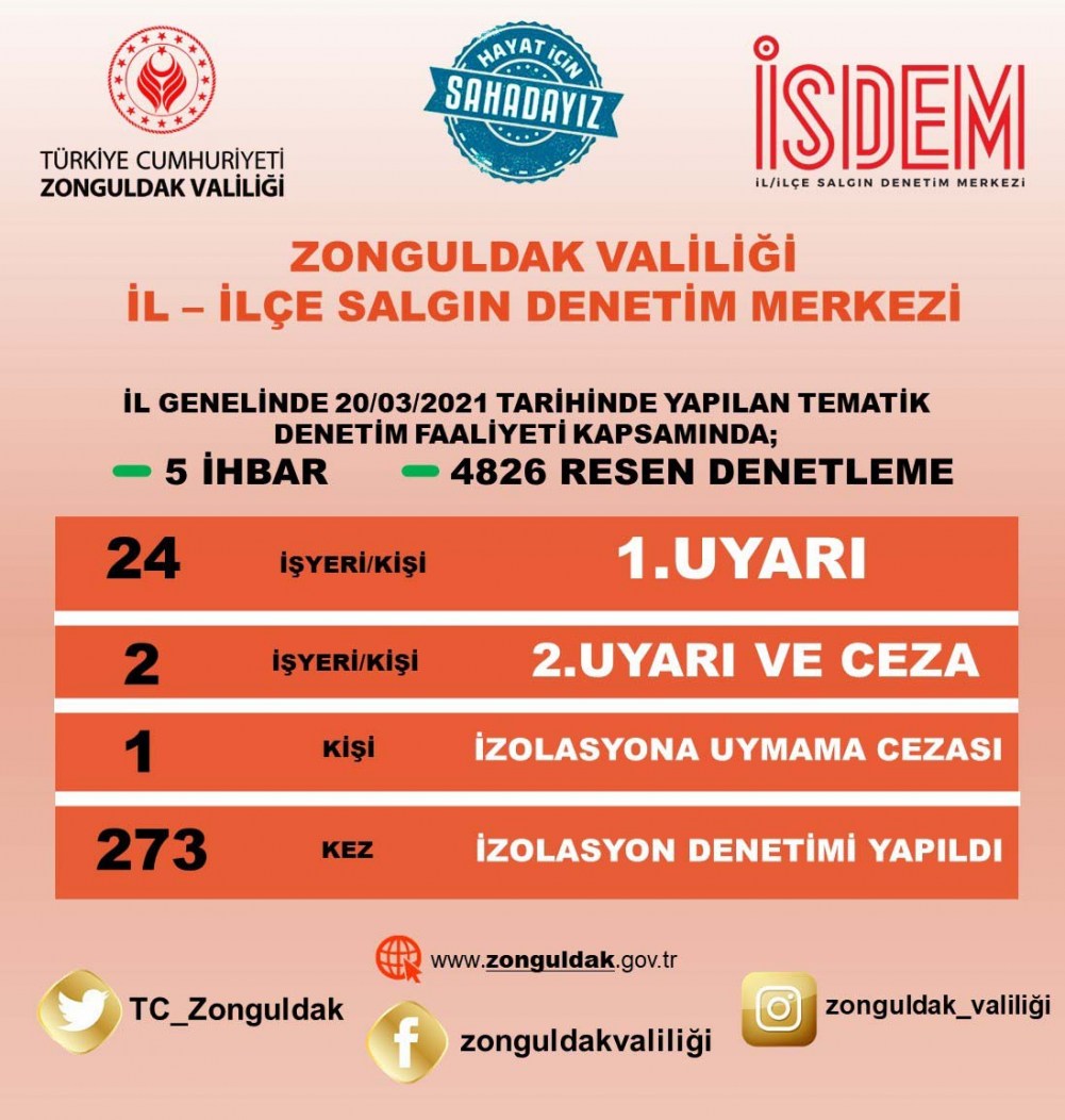 - Zonguldak Valiliği İl-İlçe Salgın Denetim Merkezi tarafından haftalık korona virüs denetimleri sürüyor.