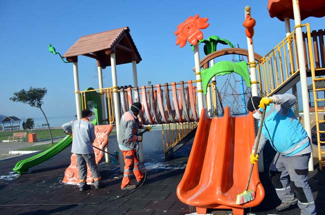 Bu çalışmalar kapsamında öncelikle halkımızın ortak kullanım noktaları başta olmak üzere, sahilimiz ve ilçemizde bulunan tüm çocuk parklarımızda dezenfekte çalışmaları yaptıklarını ifade eden Tekin, “Koronavirüs ilk olarak Çin’in Wuhan kentinde ortaya çıktığında ve hızla yayılmaya başladığında Belediye olarak İlçe merkezi genelinde sabunlu suyla dezenfekte çalışması yapmıştık.Ardından halkın ortak kullanım alanlarının başında gelen tüm Camilerimiz, Mescitlerimiz, Gasilhanemiz, otobüs duraklarımız, halk otobüslerimiz, durak taksilerimiz ve terminal ve ilçemizde bulunan umumi tuvaletleri de dezenfekte ettik. Yine sırasıyla, Belediye binamız başta olmak üzere; Adliye, Emniyet Müdürlüğü, Jandarma Komutanlığı, İtfaiye Amirliği, Alaplı Devlet Hastanesi, Alaplı Meslek Yüksek Okulu, Alaplı Yurt-Kur, Öğrenci ve Kur’an kursları, Sağlık ocakları, Sosyal Güvenlik Kurumu, Ticaret Sanayi Odası, Orman İşletme Müdürlüğü, Rehabilitasyon Merkezleri, Kapalı pazaryeri ve ilçemizde faaliyet gösteren bankalarımızda da dezenfekte çalışmaları yaptık, yapmaya da devam ediyoruz.” diye konuştu.