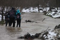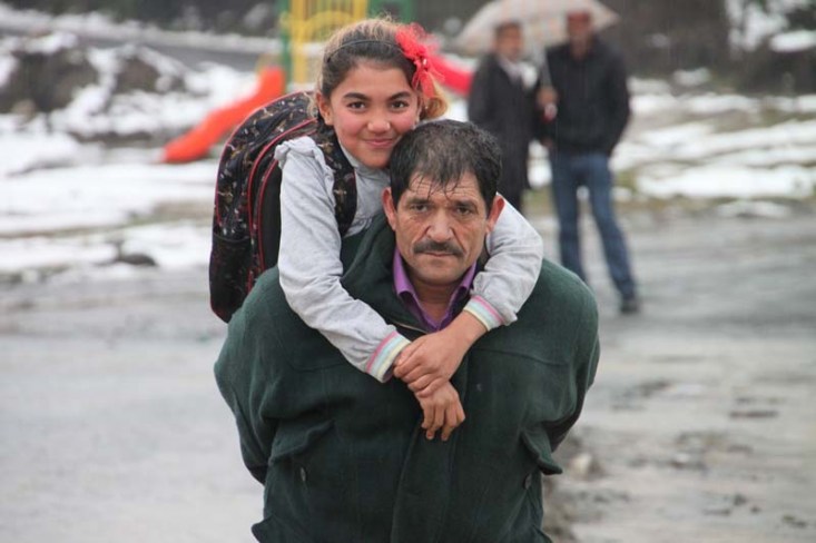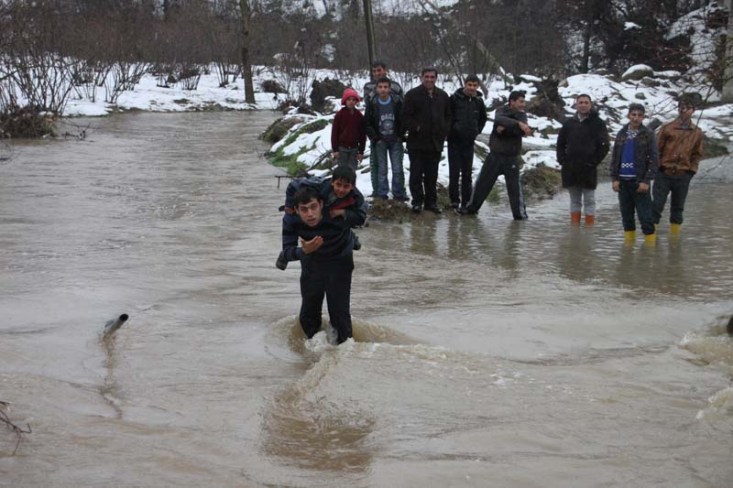 KÖYLÜLER ÇOCUKLARINI SEL SUYUNDAN KARŞI YOLA SIRTLARINDA GEÇİRİYOR