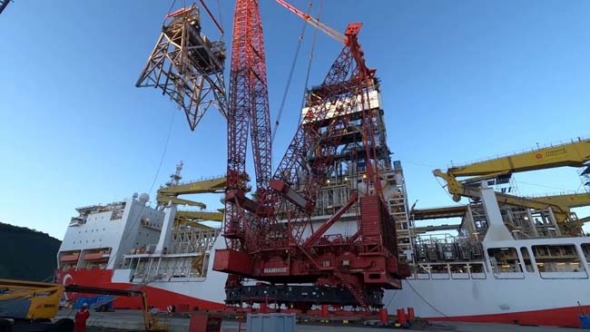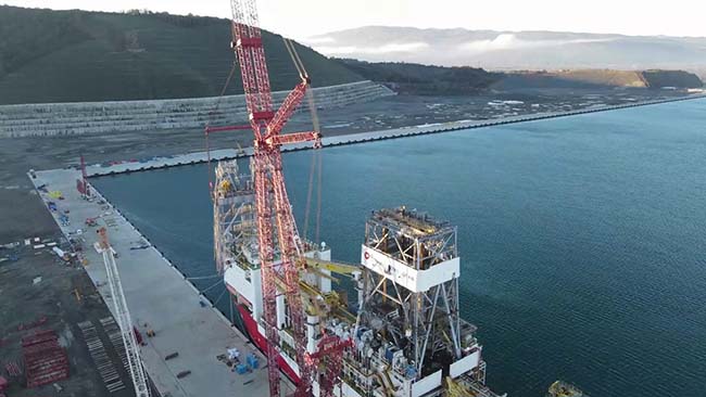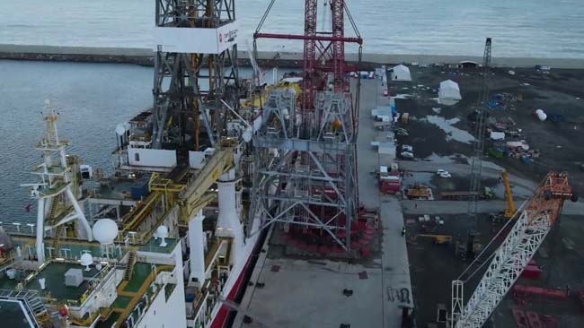 Karadeniz’de yürütülen arama çalışmalarında görev almak amacıyla yola çıkan ve geçen 7 Ekim günü Filyos Limanı'na demirleyen Yavuz Sondaj Gemisi'nin kule montajı kurulan vinçler yardımıyla devam ediyor.