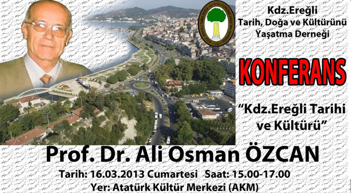 Dernek, 16.03.2013 Cumartesi günü Prof. Dr. Ali Osman Özcan'ı Ereğli'ye davet etti. Özcan, 15.00-17.00 saatleri arasında Atatürk Kültür Merkezinde "Kdz. Ereğli Tarihi ve Kültürü" konulu konferans verecek...