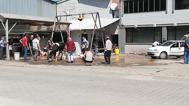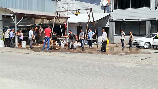 Getirilen bez yardımıyla gözleri bağlanan hayvanın inadı olayı izleyenleri gülümsetti. Hayvanın kuyruğunu tutan kasap ve beraberindekiler, adeta hayvanla birlikte dört döndü. Ayağına ip geçirilen hayvan, düzeneğe çekilerek kesildi.