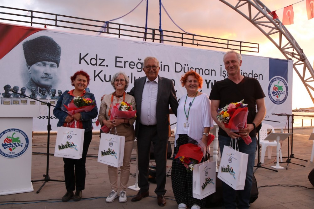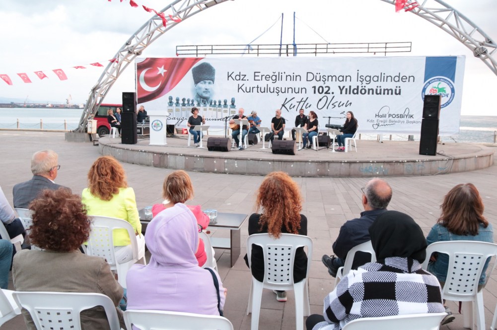 “Karadeniz Ereğli’nin düşman işgalinden kurtuluşunun 102. Yılı etkinlikleri kapsamında Amfi Tiyatro’da Ereğli’nin eşsiz günbatımı eşliğinde Yazar Gül Güleryüz, Seramik Sanatçısı Ayşe Hindistan, Şair Ayşe Eren, Ereğli ağzıyla maniler ve şiir dinletisi gerçekleştirdiler.