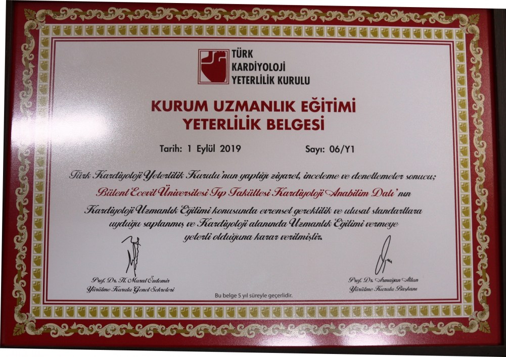 Türk Kardiyoloji Yeterlilik Kurulu tarafından Zonguldak Bülent Ecevit Üniversitesi Tıp Fakültesi Kardiyoloji Anabilim Dalı’na ’Kurum Uzmanlık Eğitimi Yeterlilik Belgesi’ verildi. Türkiye’deki kardiyoloji eğitiminin standartlarını belirlemek ve daha iyi seviyelere yükseltmek amacıyla kurulan Türk Kardiyoloji Yeterlilik Kurulu, yaptığı ziyaret, inceleme ve denetlemeler sonucunda Tıp Fakültesi Kardiyoloji Anabilim Dalı’nın Kardiyoloji Uzmanlık Eğitim konusunda evrensel gereklilik ve ulusal standartlara uygunluğunu saptayarak Kardiyoloji alanında uzmanlık eğitimi vermeye yeterli olduğunu tescilledi. Anabilim Dalının aldığı yeterlilik belgesi 2024 tarihine kadar geçerli olacak.