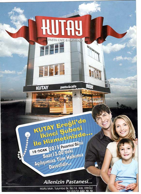 Müftü Mahallesi Yalı Caddesin de yıllardır kuru pasta, yaş pasta, tatlı,tuzlu kurabiye, tatlı çeşitleri başta olmak üzere birbirinden farklı lezze4tleri Karadeniz Ereğli halkına sunan Kutay Pasta & Cafe, 2. Şubesini Müft, Mahallesi Tuluımba Sokakta 4 katlı bir binada açmaya hazırlanıyor.