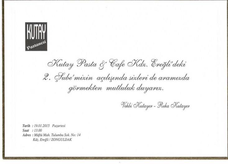 Kutay Pasta & Cafe yetkilileri; "Daha kaliteli, daha sağlıklı, hijtyyenik ve geniş bir alamnda hizmet vermek amacıyla 2. Şubemizi Karadeniz Ereğli Halkı ile buluşturacak olmanın mutluluğunu yaşıyoruz. Açılışımıza Karadeniz Ereğli halkını bekliyoruz" dediler.