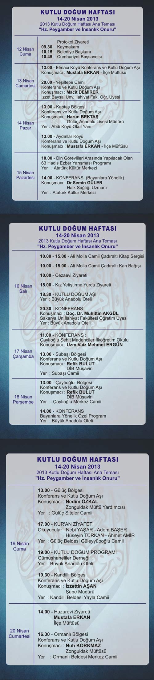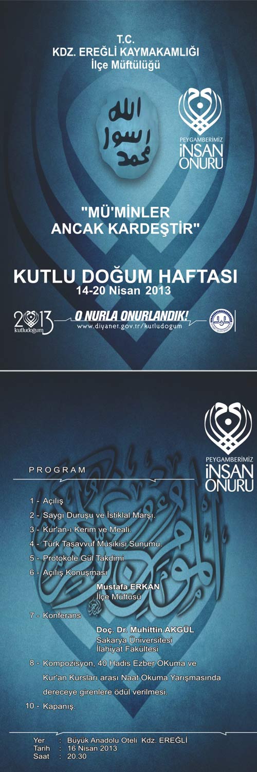 Hiç kuşkusuz Peygamber Efendimizin (sas) örnekliği ve rehberliği, insanlığın bugün içine düştüğü her türlü badireyi atlatması, zedelenen insanlık onurunun tekrar yücelmesi ve özlenen aydınlığa kavuşması yolunda yegâne melcedir. Bu duygu ve düşüncelerle Ereğli'li kardeşlerimizin ve tüm İslâm âleminin Kutlu Doğum Haftasını tebrik ediyor; haftanın, özellikle Suriye'de, Irak'ta, Arakan'da, Afrika'da, Somali'de, Mali'de, Filistin'de ve dünyanın muhtelif yerlerinde çiğnenen ve zedelenen insanlık onurunun yeniden yücelmesine ve korunmasına vesile olmasını Yüce Rabbimden niyaz ediyorum."