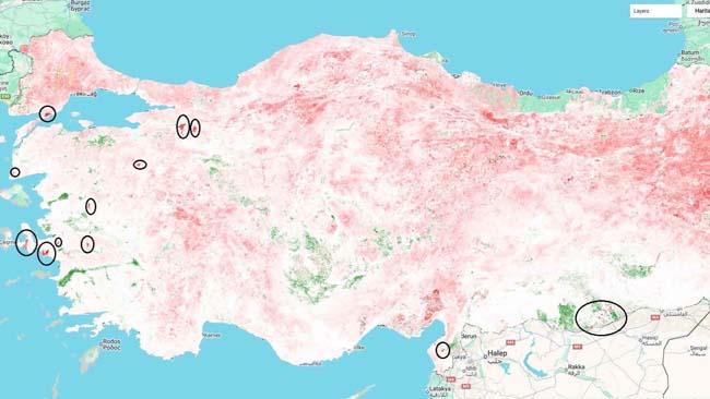 Geçtiğimiz aylarda yaşanan yangınlara işaret eden Kutoğlu, "Geçtiğimiz aylar içerisinde biliyorsunuz İzmir bölgesinde, Çeşme'de ve Seferihisar'da ciddi yangınlar olmuştur. Orada tabii bitki örtüsü ve su içeriği tamamen ortadan kalktığı için bunları koyu kırmızı görüyoruz. Yine Çanakkale'de, İzmit'te yanan bölgeleri koyu kırmızı olarak görüyoruz ama diğer bölgeler Türkiye'nin tamamına baktığınızda pembe, kızıla çalan renkler var. Yani ülke genelinde ciddi bir kuraklık söz konusu. Bitkilerde bu kuraklık nedeniyle su içeriğini kaybetmişler. Yani su stresine girmişler. Haritada yeşil alanlar var. Bitkilerin Haziran'dan Ağustos ayına yeşerdiğini, boylarının uzadığını, su içeriklerinin arttığını görüyoruz. Bunlar tarım alanları da olabilir veya su kenarlarındaki kendiliğinden gelişen mera alanları da olabilir. Bazı alanlarımızda da ama az sayıda da olsa bazı bölgelerde bitkilerin boy attığını ya da su içeriğinin arttığını görüyoruz. Onlar sağlıklı büyümelerini görüyoruz. O bölgelerde bitkiler sağlıklı gelişimlerini sürdürmüştür" diye konuştu.