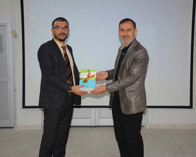 Program sonunda Daire Başkanı Osman Demir, Dr. Öğr. Üyesi Erdem Dirimeşe'ye Prof. Dr. Teoman Duralı kitaplarından oluşan bir set hediye etti.