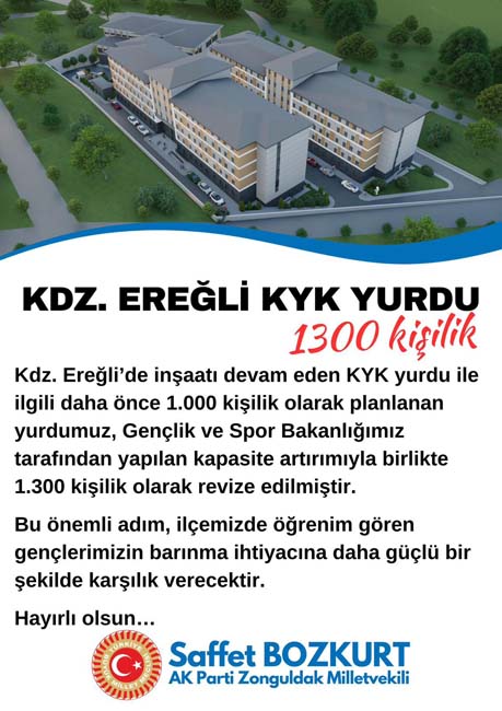 “Kdz. Ereğli’de inşaatı devam eden KYK yurdu ile ilgili daha önce 1.000 kişilik olarak planlanan yurdumuz, Gençlik ve Spor Bakanlığımız tarafından yapılan kapasite artırımıyla birlikte 1.300 kişilik olarak revize edilmiştir.