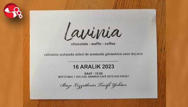 “Bazı lezzetlerin tarifi yoktur” sloganıyla hizmet vermeye başlayan Lavinia Cafe, resmen 16 Aralık Cumartesi günü saat 13.00’de Müftü Mahallesi İbrahim Efe Caddesi Arabica Cafe üstü Kdz.Ereğli adresinde resmi açılışını yaparak.