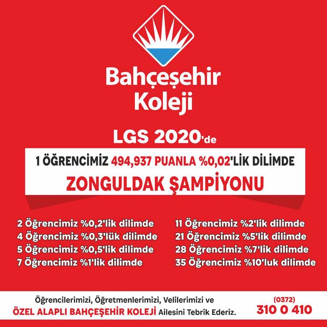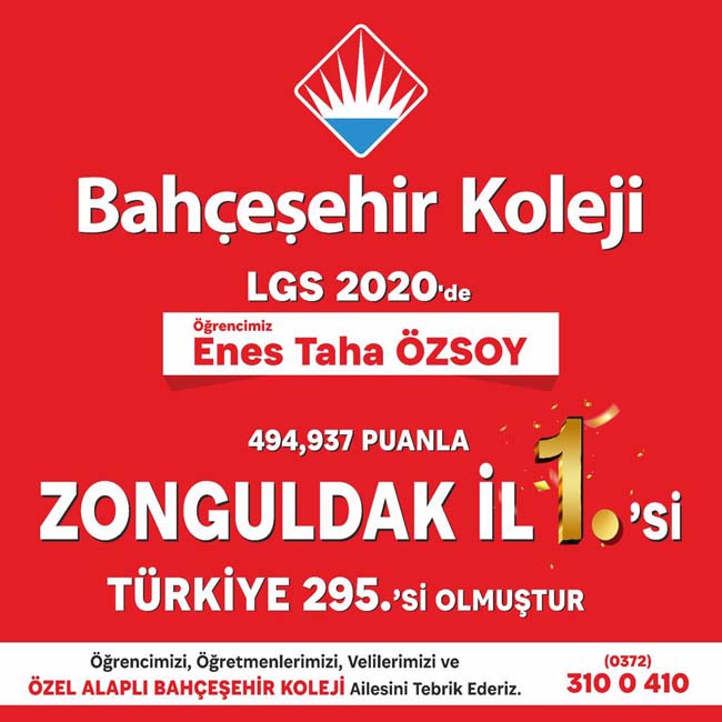 LGS 2020’de Zonguldak İl Şampiyonu ve Türkiye 295. si Özel Alaplı BAHÇEŞEHİR KOLEJİ’nden