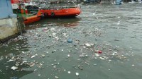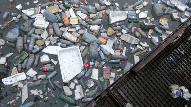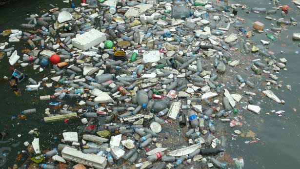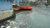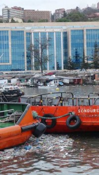 teknelerinin arasındaki su yüzeyini kaplayan pet şişeler, cam şişeler, köpük tabaklar,