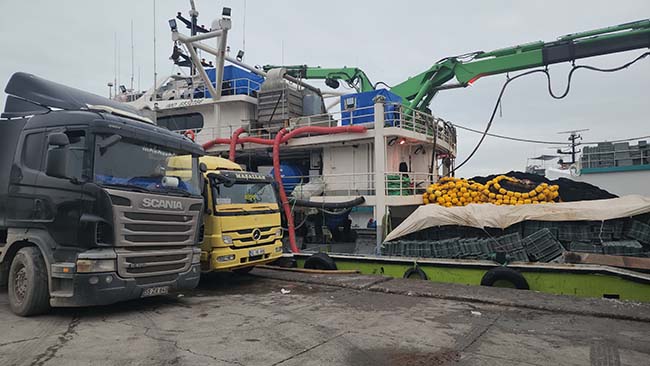 Zonguldak'ın Ereğli ilçesinde fabrikalara gönderilmek istenen balıklar, limana yanaşan teknelerden tırlara yüklendi.