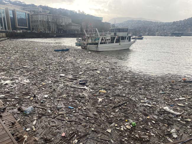 Zonguldak’ta hafta sonu şehri etkisini altına alan kuvvetli yağış ve fırtına devam ediyor. Fırtınayla birlikte derelerden sürüklenen yüzlerce plastik atık ve odun parçası limanda toplandı. Atıkların limanda toplanmasıyla birlikte denizin