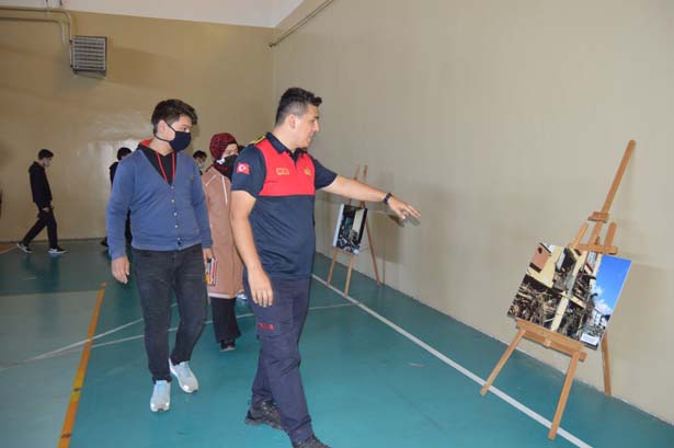 Tatbikat bitiminde öğrenciler, okulun spor salonunda sergilenen Kdz. Ereğli Belediyesi İtfaiye ekiplerinin farklı zamanlardaki kurtarma operasyonlarında çekilen fotoğraflarını inceledi.