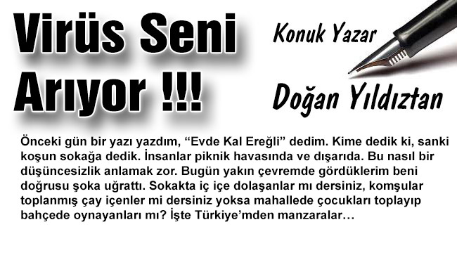 Önceki gün bir yazı yazdım, “Evde Kal Ereğli” dedim. Kime dedik ki, sanki koşun sokağa dedik. İnsanlar piknik havasında ve dışarıda. Bu nasıl bir düşüncesizlik anlamak zor. Bugün yakın çevremde gördüklerim beni doğrusu şoka uğrattı. Sokakta iç içe dolaşanlar mı dersiniz, komşular toplanmış çay içenler mi dersiniz yoksa mahallede çocukları toplayıp bahçede oynayanları mı? İşte Türkiye’mden manzaralar…