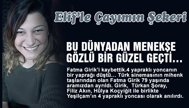 Fatma Girik’i kaybettik.4 yapraklı yoncanın bir yaprağı düştü… Türk sinemasının mihenk taşlarından olan Fatma Girik 79 yaşında aramızdan ayrıldı. Girik, Türkan Şoray, Filiz Akın, Hülya Koçyiğit ile birlikte Yeşilçam’ın 4 yapraklı yoncası olarak anılırdı.