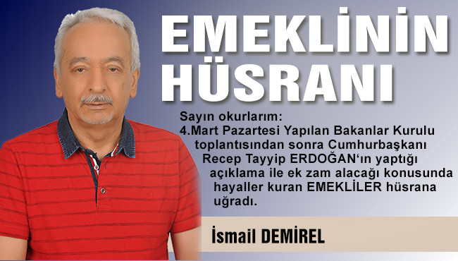 4.Mart Pazartesi Yapılan Bakanlar Kurulu toplantısından sonra Cumhurbaşkanı Recep Tayyip ERDOĞAN‘ın yaptığı açıklama ile ek zam alacağı konusunda hayaller kuran EMEKLİLER hüsrana uğradı.