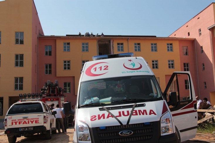 Karadeniz Ereğli'de Fen Lisesi inşaatının çatısına çıkan 6 işçi 8 aydır maaşlarını alamadıkları gerekçesiyle intihar teşebbüsünde bulundu.