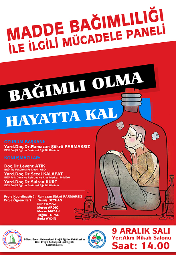 Karadeniz Ereğli Belediyesi ile Bülent Ecevit Üniversitesi (BEÜ) Ereğli Eğitim Fakültesi işbirliği ile hazırlanan 'Madde Bağımlılığı ile Mücadele' paneli 09 Aralık 2014 Salı günü saat 14.00'te Atatürk Kültür Merkezi Nikâh Salonu'nda gerçekleştirilecek.