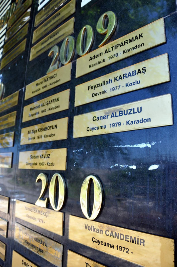 Genel Maden İşçileri Sendikası'nın girişimleri ile Türkiye Taşkömürü Kurumu tarafından yapılan ve açılış kurdelesini Başbakan Recep Tayyip Erdoğan'ın yaptığı maden şehitleri anıtındaki tabelalar dökülmeye devam ediyor.