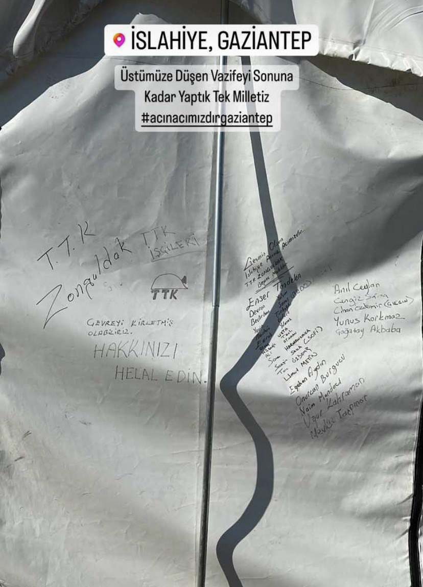 Zonguldaklı madenciler, deprem bölgesi Gaziantep’ten ayrılmadan önce kaldıkları çadıra,’TTK Zonguldak İşçileri, çevreyi kirletmiş olabiliriz, hakkınızı helal edin’ şeklinde not yazdı.