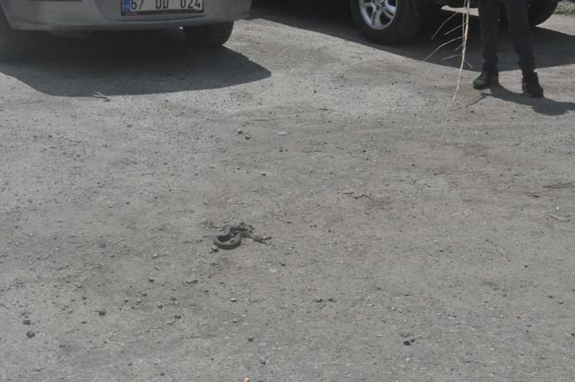Zonguldak'ta bir cami yakınında kuyruğunun üzerinden otomobil geçen 3 metre uzunluğundaki su yılanı korkuya neden oldu. Yılan mahalle muhtarı tarafından sopayla dereye bırakıldı.
