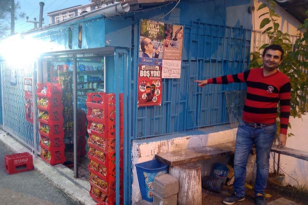 yıllardır mahalle bakkalı işleten Mehmet Kocaman, bakkalın girişine astığı