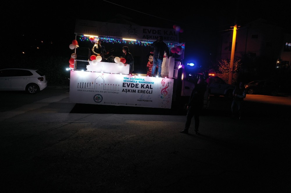 “Evde Kal Aşkım Ereğli” sloganıyla donatılmış, üstü açık müzik aracı, Cuma gününden itibaren Korubaşı Toki, Uzunmehmet, Kestaneci, Çevdarlı, Süleymanlar, Orhanlar, Yeşiltepe-Kepez’in bir bölümü, Bağlık Mahallesi’nin bir bölümü ile ana güzergahlarda ailelere, çocuklara moral oldu.