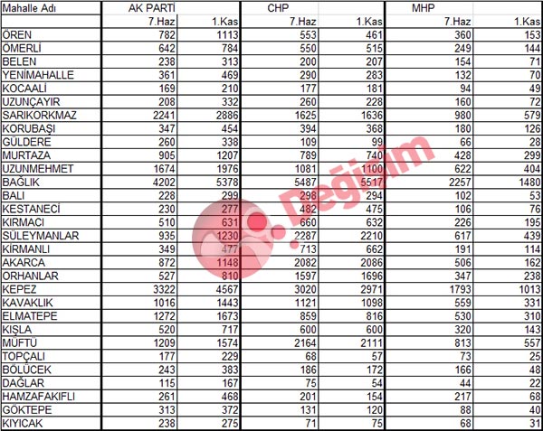 CHP ayrıca Ömerli, Belen, Kocaali, Sarıkorkmaz ve Uzunmehmet mahallelerinde de ikinci parti çıkmasına rağmen oylarını arttırdı. Ana Muhalefet partisi ise Kışla mahallesinde 7 Haziran'da aldığı oyu aynen korudu. Kışla'da CHP, her iki seçimde de 600 oy aldı. CHP'nin oyunu arttırdığı mahalleler Ömerli, Belen, Kocaali, Sarıkorkmaz, Uzunmehmet, Bağlık, Akarca ve Orhanlar mahalleleri oldu. Başka bir deyişle bu mahallelerde hem AK parti, hem de CHP oylarını arttırdı.