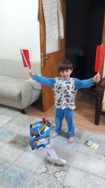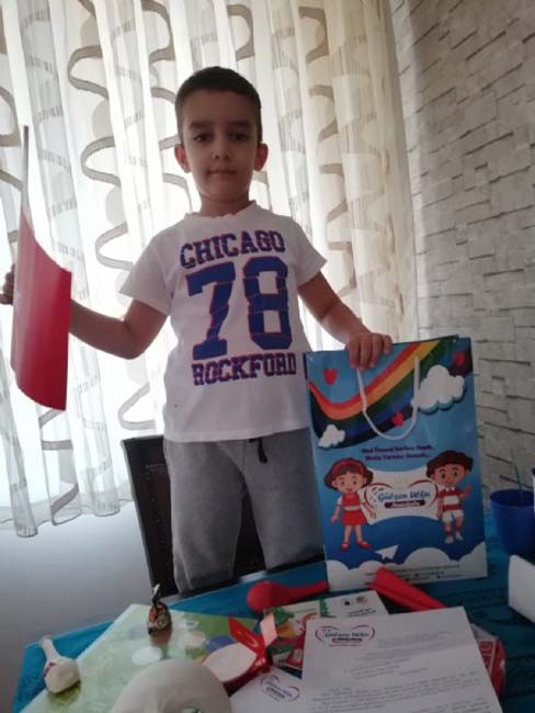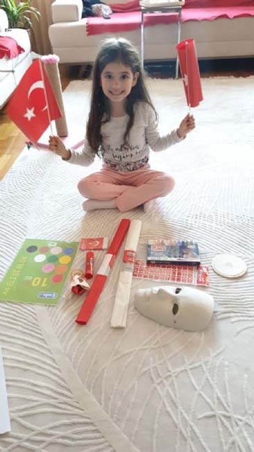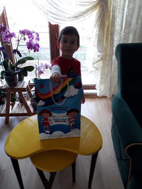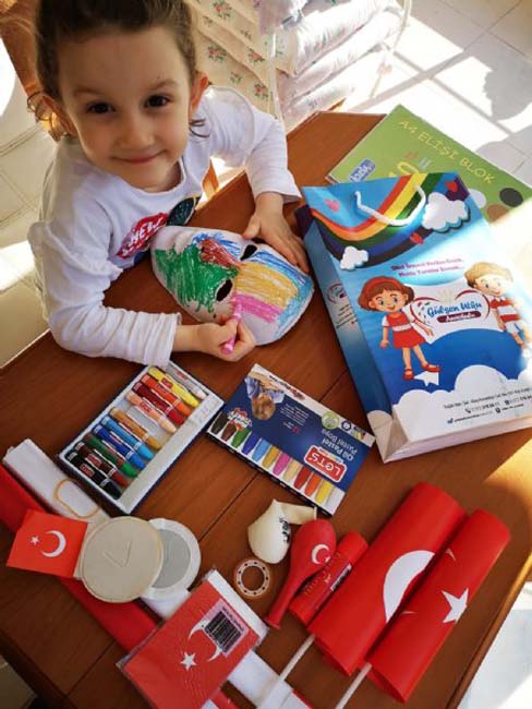 Etkinlik kapsamında okul öğrencilerinin bayram coşkusunu evlerinde yaşaması için hazırlanan ve içinde bayrak, kırtasiye malzemeleri ve süslemelerin bulunduğu paket özel kuryeyle evlere ulaştırıldı.
