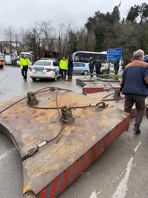 Zonguldak’ın Karadeniz Ereği ilçesinde vinç ağırlığı olarak kullanılan malzeme TIR korsesinden kayarak yola savruldu.