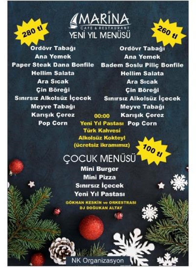 Lezzetli yemek menüleri arasında; Ordöv Tabağı, Ana Yemek, Paper Seak Dana Bonfile, Hellim Salata, Ara Sıcak, Çin Böreği, Sınırsız Alkolsüz İçecek, Karışık Çerez, Pop Corn’un yanında Yeni Yıl Pastası, Türk Kahvesi, Alkolsüz Kokteylin yanı sıra Çocuk Menüsünde ise; Mini Burger, Mini Pizza, Sınırsız İçecek, Yeni Yıl Pastası ile yeni yılı karşılamak isteyenleri Marına Cafe Restaurant’a bekliyoruz.