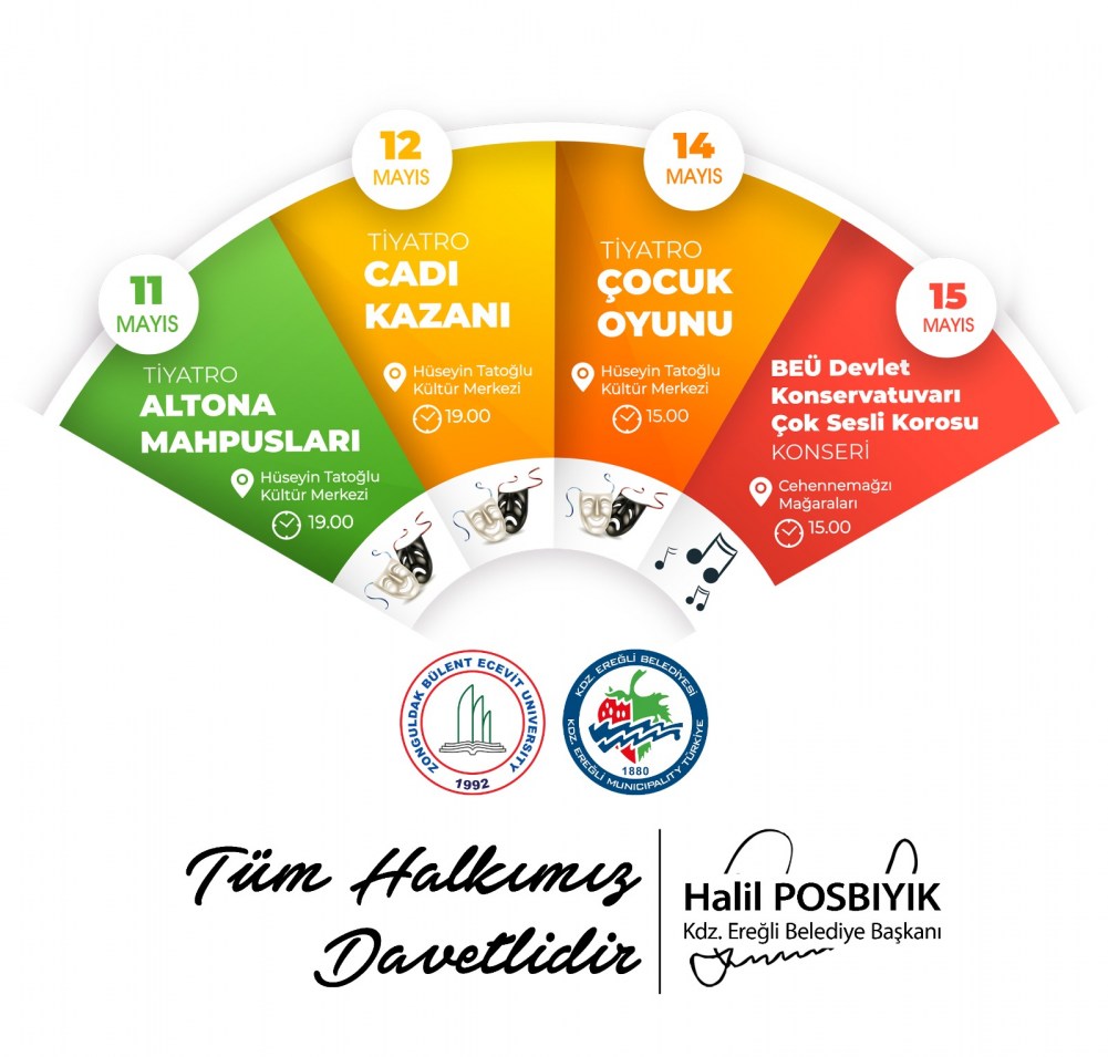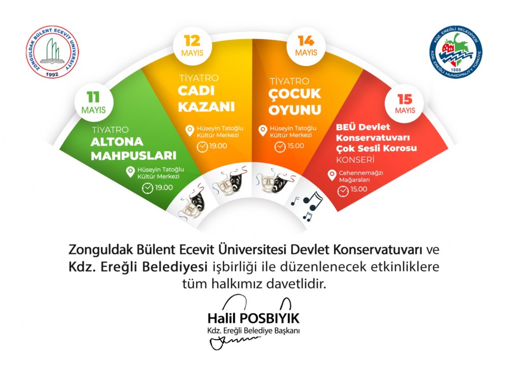 Kdz. Ereğli Belediye Başkanı Halil Posbıyık, Zonguldak Bülent Ecevit Üniversitesi Devlet Konservatuvarı ve Kdz.Ereğli Blediyesi işbirliği ile düzenlenen kültür ve sanat etkinliklerinin saatlerinin yeniden düzenlendiğini duyurdu.