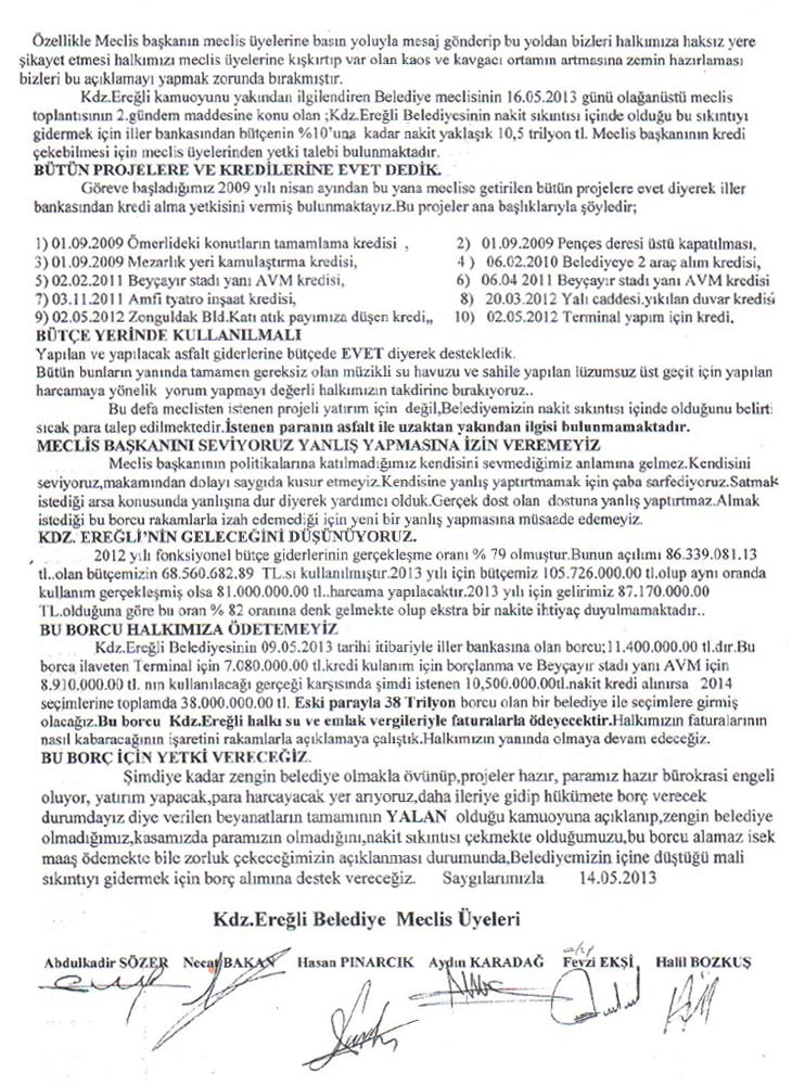 CHP üyesi Fevzi Ekşi, bağımsız kalan Abdulkadir Sözer, Necat Bakan, Hasan Pınarcık, Aydın Karadağ ve Halil Bozkuş imzalı yazılı açıklamada, belediyenin borç para almasıyla ilgili, aynı zamanda Meclis Başkanı Ereğli Belediye Başkanı Halil Posbıyık'ın basın yoluyla yaptığı açıklamaların, kendilerini haksız yere halka şikayet ettiği gerekçesiyle açıklama yapmak zorunda kaldıklarını bildirdiler.