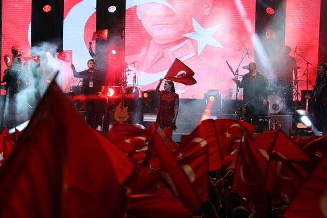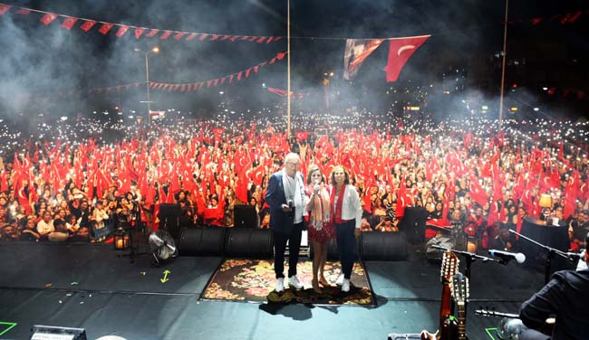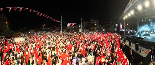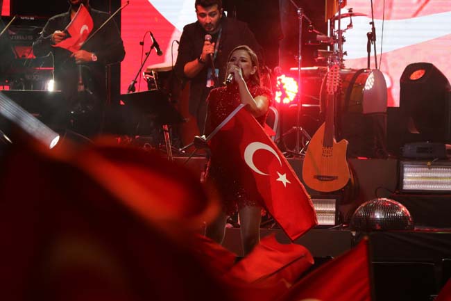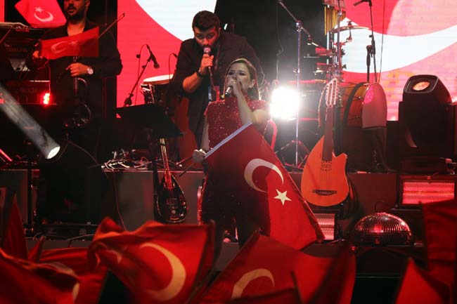 Elinde Türk Bayrağıyla şarkılarının yanında marşlar da söyleyen ünlü sanatçı 2 saat boyunca Ereğlilere unutulmaz bir gece yaşattı.