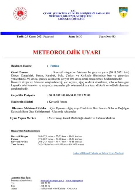 “Meteoroloji Genel Müdürlüğü tarafından kuvvetli rüzgar ve fırtınanın bu gece ve yarın (Salı) günü Düzce, Zonguldak, Bartın, Karabük, Bolu, Çankırı ve Kırıkkale illerimizde batı ve güneybatı yönlerden 60-90 km yüksek kesimlerde ise yer yer 100 km üzeri hızda esmesinin beklendiğini duyurdu. Yapılan açıklamada, “Kuvvetli rüzgar ve fırtınanın oluşturabileceği çatı uçması, ağaç ve direk devrilmesi, soba ve baca gazı kaynaklı zehirlenmeler ve ulaşımda aksamalar gibi olumsuzluklara karşı dikkatli ve tedbirli olunması gerekmektedir” denildi.