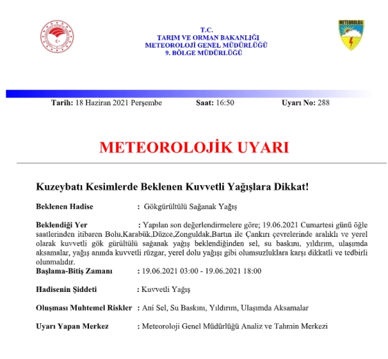 Meteoroloji Genel Müdürlüğü’nden yapılan açıklamaya göre; 19.06.2021 Cumartesi günü öğle saatlerinden itibaren Bolu,Karabük,Düzce,Zonguldak,Bartın ile Çankırı çevrelerinde aralıklı ve yerel olarak kuvvetli gök gürültülü sağanak yağış beklendiğinden sel, su baskını, yıldırım, ulaşımda aksamalar, yağış anında kuvvetli rüzgar, yerel dolu yağışı gibi olumsuzluklara karşı dikkatli ve tedbirli olunmalıdır.