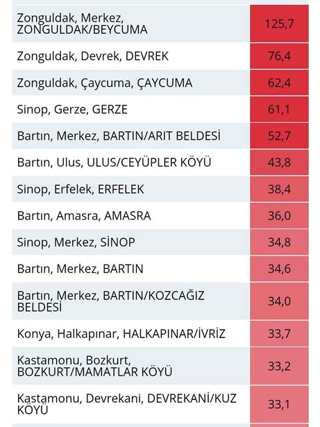 12.08.2021 - 13.08.2021 tarihleri arasında ülke genelinde en fazla yağış alan bölgeler Batı Karadeniz oldu. Meteoroloji Genel Müdürlüğü’nden yapılan açıklamaya göre, Zonguldak Merkez ve Beycuma’da metrekareye 125,7 kilogram yağış düştü. Zonguldak’ın Devrek ilçesine 76,4 kilogram yağış düşerken, Çaycuma’ya 62,4 kilogram yağış ile tabloda 3. sırada yer aldı. Tablodaki verilere göre, Bartın Merkez’e 52,7 kilogram, Ulus Ceyüpler Köyü’ne 43,8 kilogram yağış düştü. Aynı tabloda Sinop Merkez ile Kastamonu Bozkurt ve Devrekani ilçeleri de (38-33 kilogram yağış) yer alıyor.