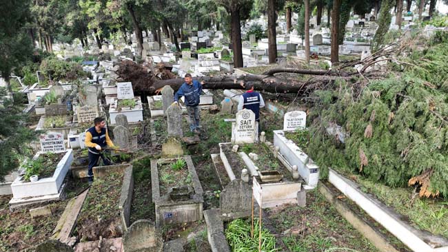 Ekipler, yıkılan ağaçları kaldırma çalışmalarına başlarken Mezarlıklar Müdürlüğü ve Afet Yönetmeliği’ne göre gerekli tespitleri yapıyor. Ağaçlardaki tehlike nedeniyle mezarlıklara giriş ve çıkışlar kontrollü olarak sağlanıyor.