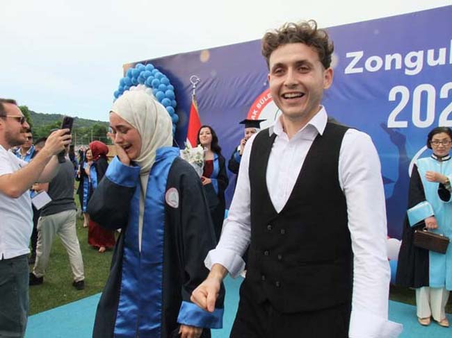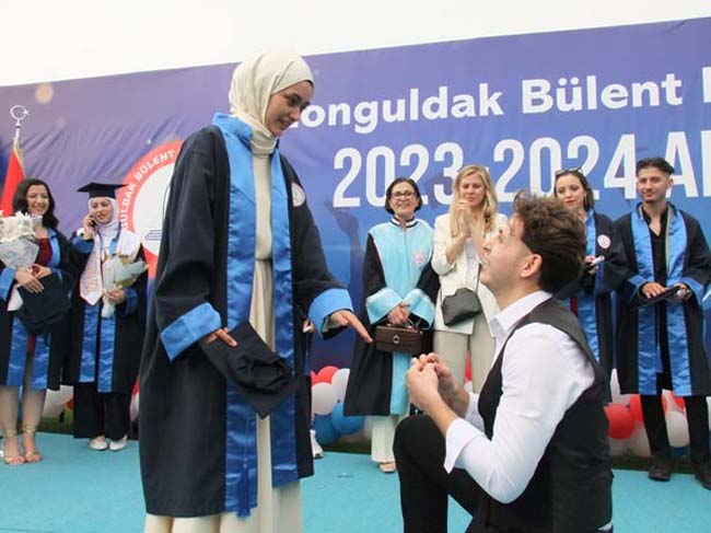 2023-2024 Akademik Yılı Zonguldak Bülent Ecevit Üniversitesi Devrek, Çaycuma ve Gökçebey Meslek Yüksekokulların mezuniyet töreni, Çaycuma Meslek Yüksekoklu Ormancılık bölümü öğrencisi Beyzanur Kaya'ya, erkek arkadaşı Tekirdağ Namık Kemal Üniversitesi Mekatronik bölümü öğrencisi Akın Kalaycıoğlu'nun yaptığı evlilik teklifine sahne oldu.
