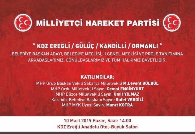 10 Mart Pazar Günü Saat 14:00'de Büyük Anadolu Otelde Yapacağımız " Kdz Ereğli, Gülüç, Kandilli, Ormanlı Belediye Başkan Adayları, Belediye Meclis ve İl Genel Kadroları Tanıtım Programı ve Proje Tanıtımına" Tüm Halkımız Davetlidir.