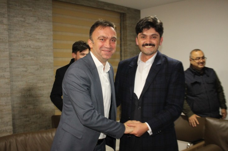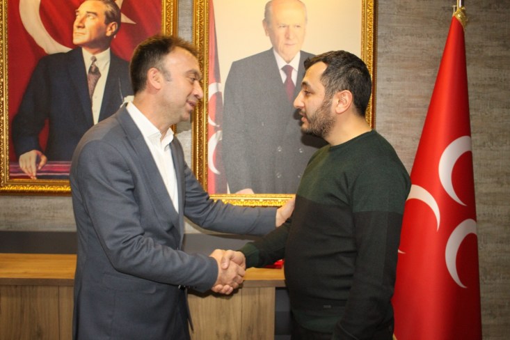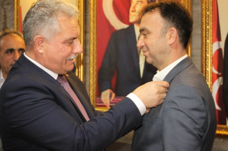 Parti rozeti Milliyetçi Hareket Partisi İlçe başkanı Rahman Demirtürk tarafından takılan Tuncay Aydın tebrikleri kabul etti.