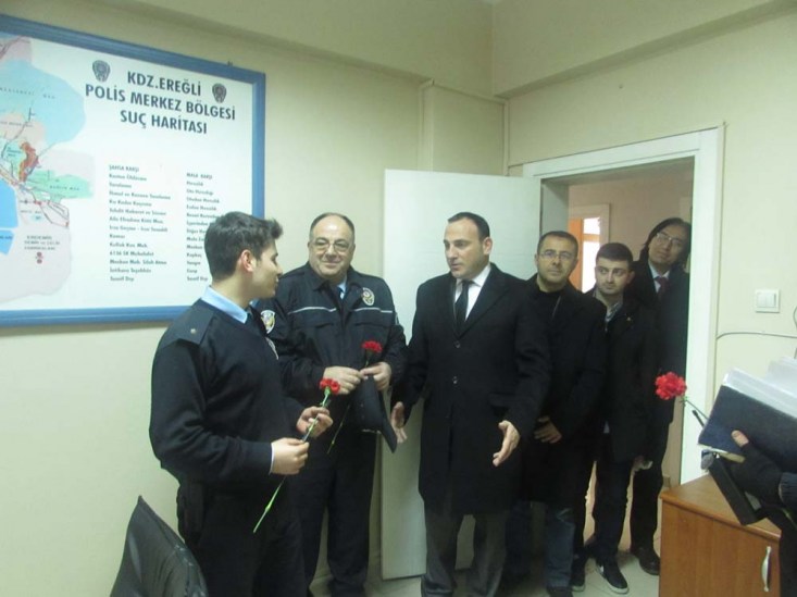 KDZ.Ereğli MHP İlçe Başkanı ve Yönetim Kurulu Üyeleri ikramlardan sonra günün anısına Emniyet Müdürü Fahri Küçük'e çerçeveli bir Türk Bayrağı hediye ettiler. Daha sonra emniyet müdüründen alınan izinle memurlara karanfil dağıtımıyla beraber başsağlığı dilediler.