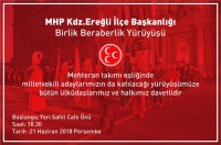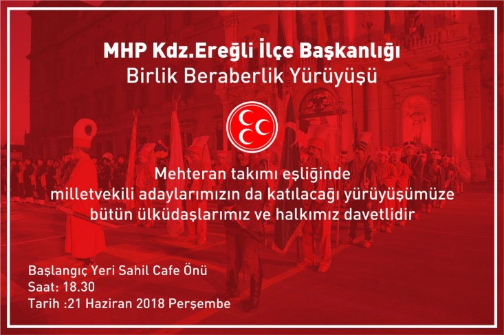 Zonguldak Ereğli Milliyetçi Hareket Partisi (MHP) İlçe Başkanlığı tarafından "Birlik Beraberlik Yürüyüşü" düzenleneceği bildirildi.
