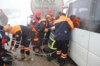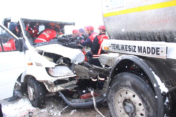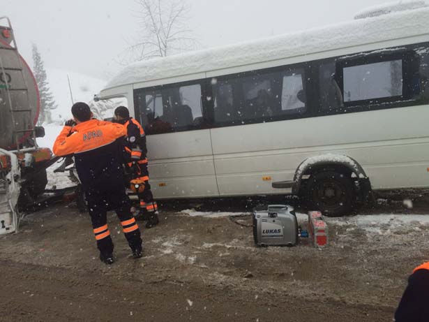 Çarpmanın etkisi ile midibüs sürücüsü Ayhan K. şoför mahalinde sıkıştı. Araçta